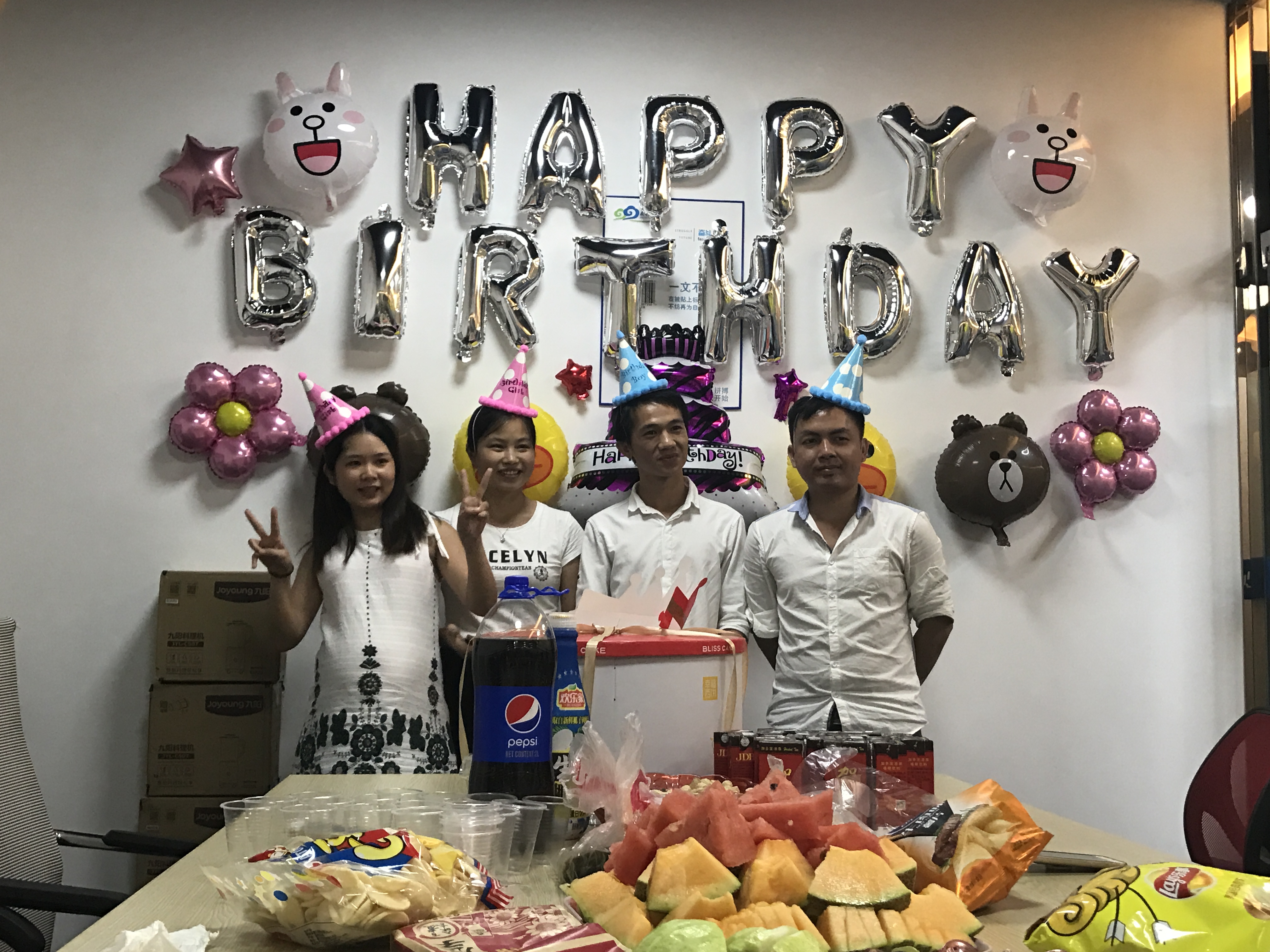 公司每个月份过生日的员工都会收到一份惊喜。为了更进一步落实“以人为本”的精神,显现企业文化的作用,提升员工的认同感和归属感,真正地融入集体大家庭。带个8月份生日员工的惊喜是――生日Party!